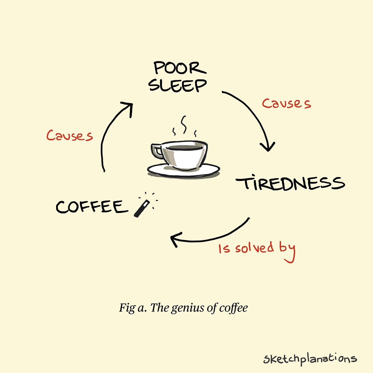 Too much coffee leads to poor sleep, which leads to waking up tired, which leads to craving that glorious coffee fix to make the tired go away. An ingenious self-reinforcing cycle.