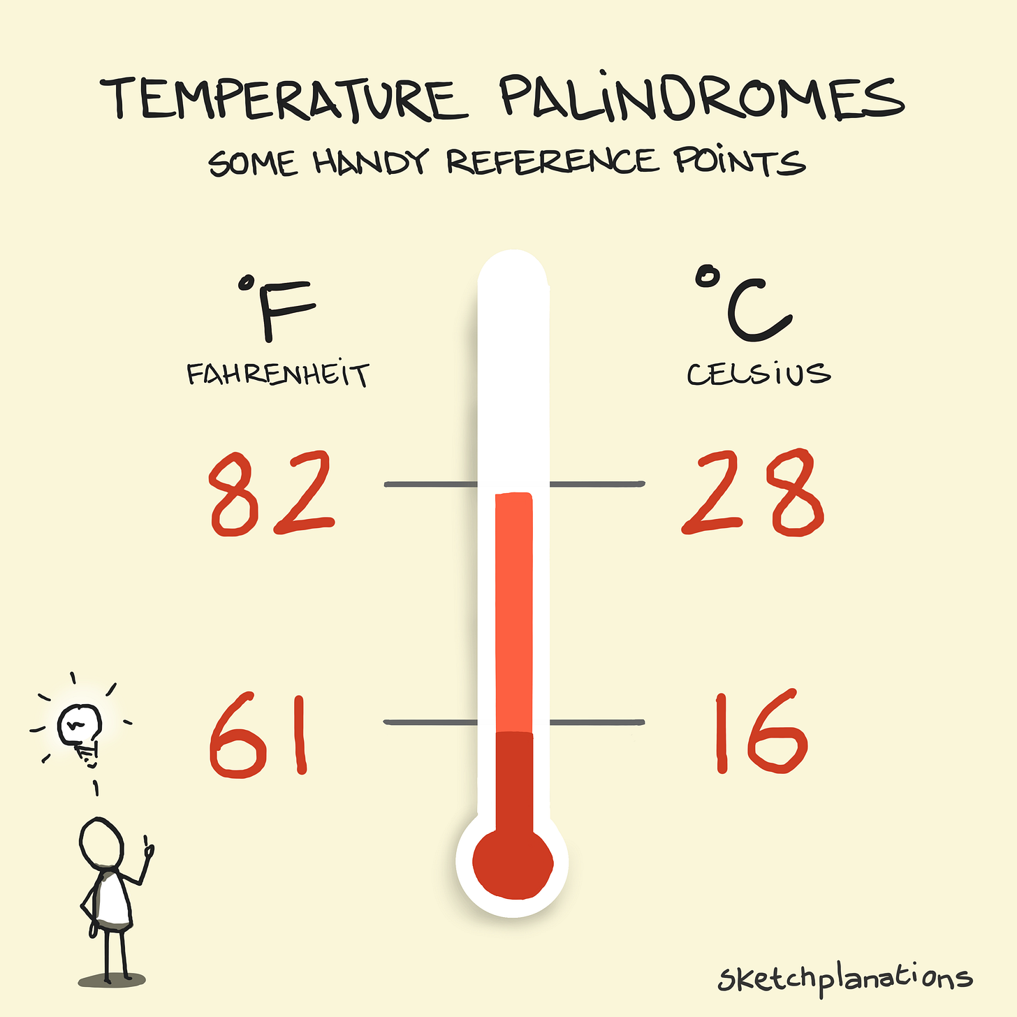 These two temperature palindromes are handy markers for gauging temperatures in both Fahrenheit and Celsius—and they’re surprisingly accurate: