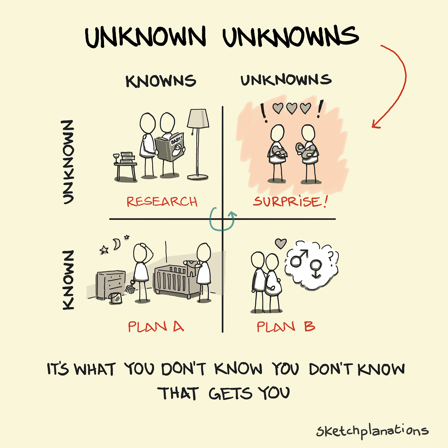 Unknown Knowns — things you know that people know about being a parent and having a baby, but you just don't know them yet. Doing your research and homework transforms these into Known Knowns.